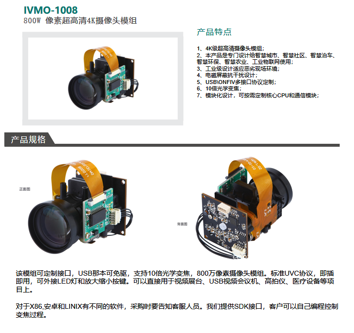IVMO-1008 800万像素4K超高清摄像头模组
